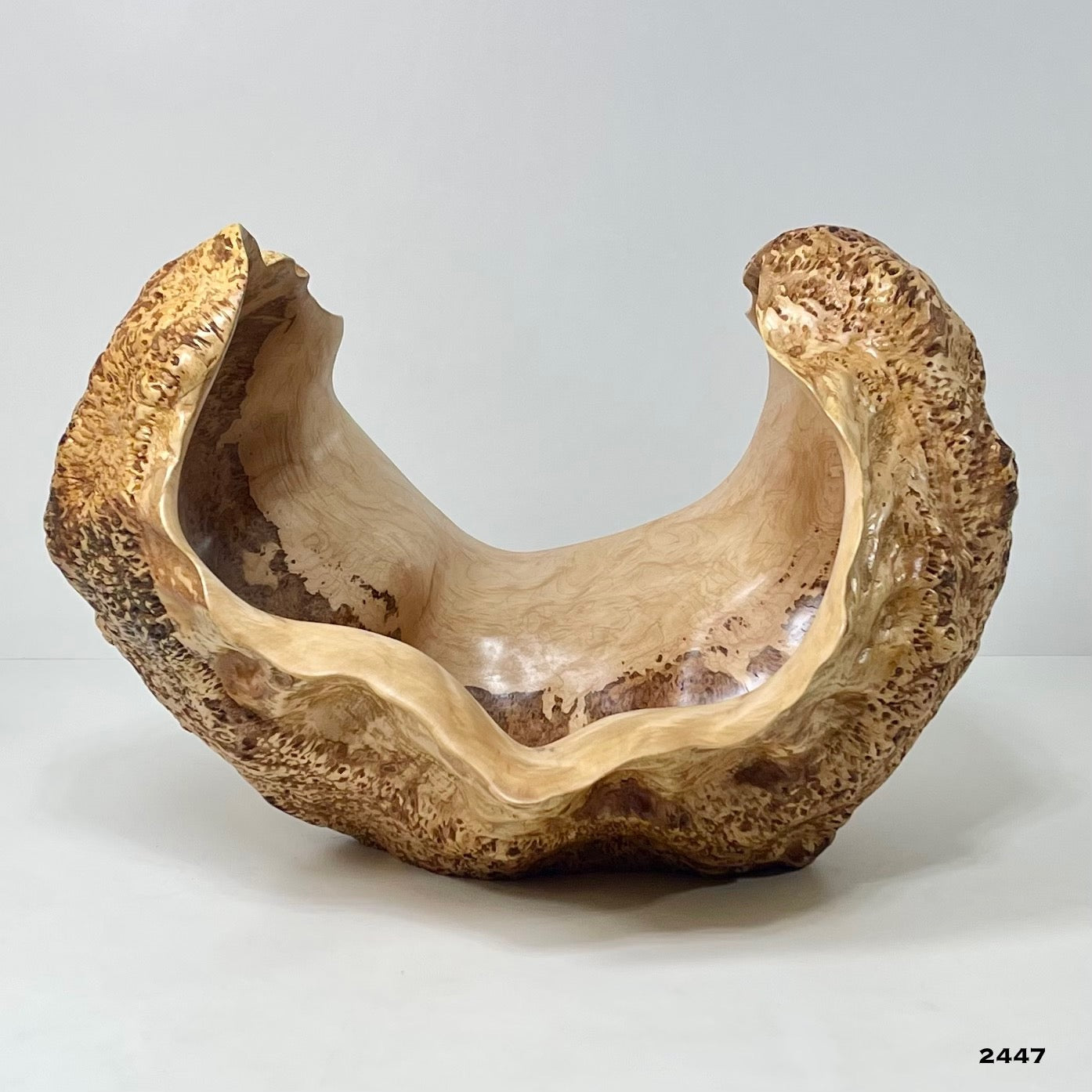 Each carved burl is a unique piece. When carving, we strive to follow the naturally grown exterior form to achieve a balance between the natural exterior and our smooth carved interior.